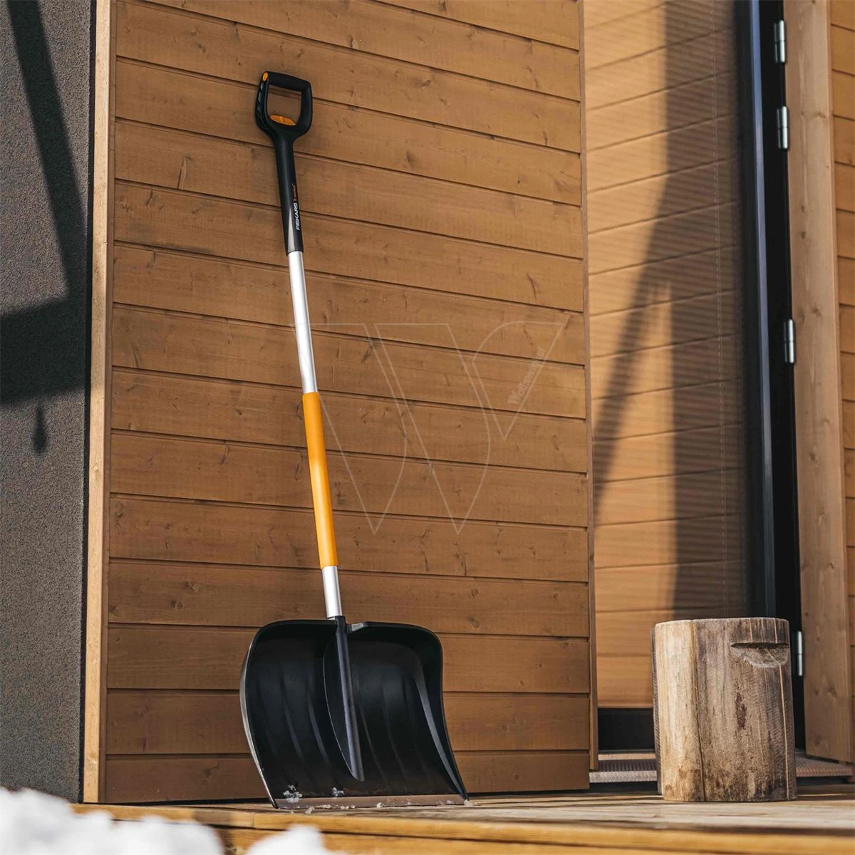 - De Fiskars X-serie™ telescopische sneeuwruimer heeft een breed blad en instelbare handgreep voor het gemakkelijk en ergonomisch ruimen van sneeuw op opritten en paden