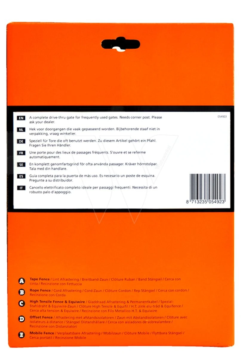 Een compleet hek, eenvoudig mee te nemen en op te hangen op plaatsen waar u vaak door een hek moet rijden. De trekker duwt het hek, dat onder spanning staat, zelf open