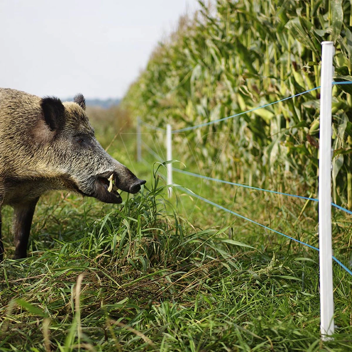 Blauw kunststofdraad speciaal ontwikkeld om wilde dieren buiten te houden, in het bijzonder geschikt voor wilde zwijnen. Studies tonen aan dat wilde zwijnen een slecht gezichtsvermogen hebben en voornamelijk de kleur blauw zien. Bescherm uw gewas met deze zeer geleidende draad.