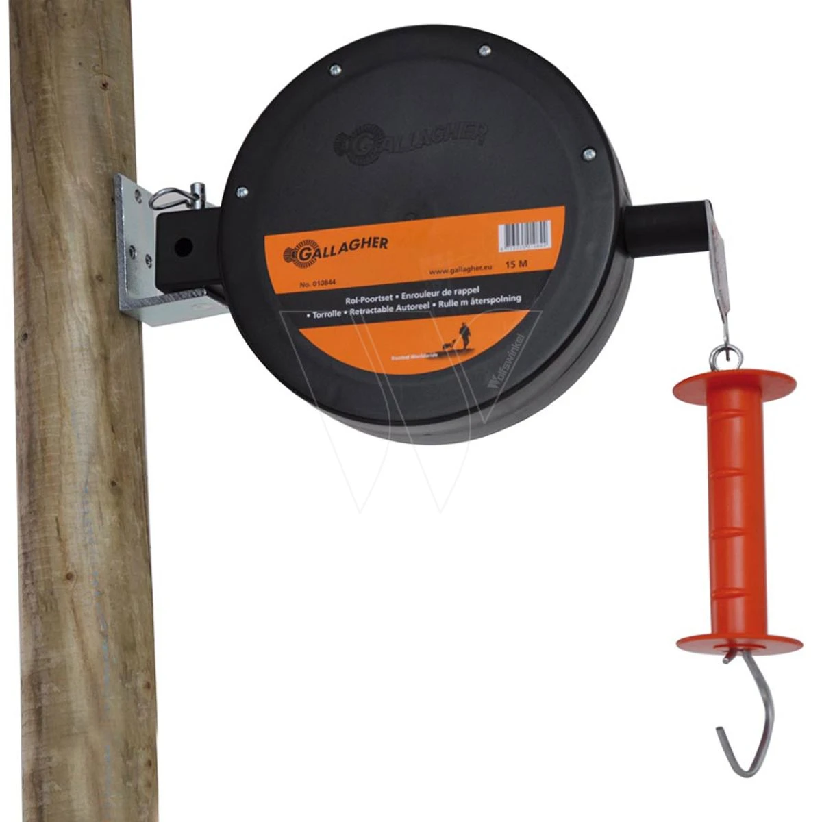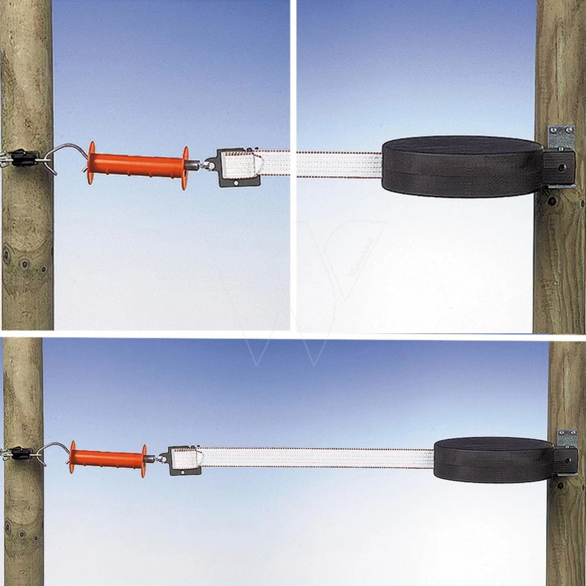 Met deze rol-poortset kunt u snel en eenvoudig een doorgang in uw afrastering realiseren. Het 40mm TurboLine lint wordt automatisch af- en opgerold over een maximale lengte van 15 meter. Het lint is simpel uit te trekken en met de bijgeleverde poortgreep in een poortgreepanker te haken. De rol-poortset wordt geleverd inclusief bevestigingsbeugel voor montage aan een houten paal.