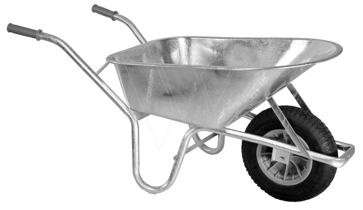 Deze kruiwagen is geheel gegalvaniseerd. Een rond buizenframe draagt een zinkkleurige laadbak met een inhoud van 85 liter.