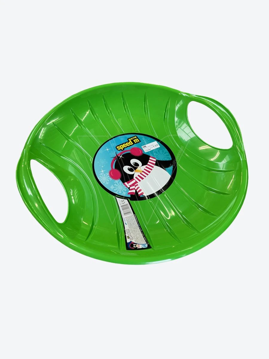 Deze sneeuw glijschotel is geschikt voor kinderen vanaf 4 jaar. Kinderen kunnen op de schotel plaats nemen en zicht vasthouden aan de verstevigde handvaten die aan de zijkant van de schotel zitten. De schotel is gemaakt van kunststof. De doorsnee van de schotel is 65cm.
