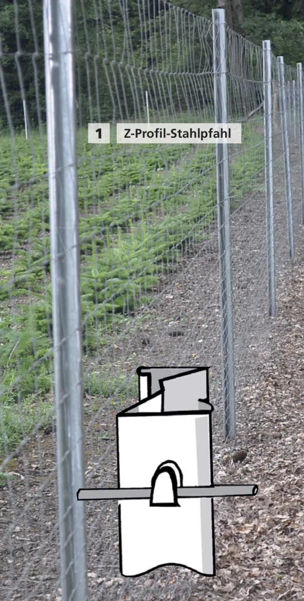 Z-profiel stalen paal koud gevormd uit zwaar gegalvaniseerd bandstaal (ca. 230 g/ m2). Zeer stabiel en toch elastisch! De haken zijn op 10 cm van elkaar uitgespaard om in het gaas te haken. Door de netten afwisselend in te haken, wordt de installatie veel gemakkelijker, wordt het net in de hoogte gespannen en wordt het loshaken door wild voorkomen. De zware galvanisatie en de materiaaldikte van 1,5 mm garanderen een lange levensduur en de herbruikbaarheid van de palen. Boringen in de paal maken het mogelijk gemakkelijk hoekbeschoeiingen te maken door ze aan elkaar te schroeven. Spanningsbruggen kunnen ook heel gemakkelijk worden ingebracht.